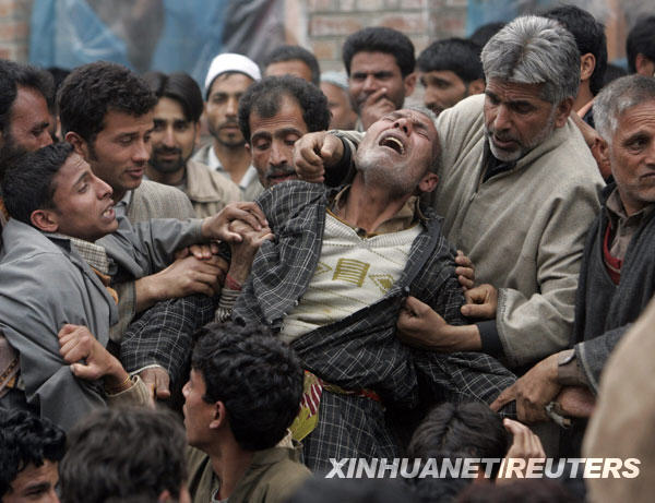 3月24日,在印控克什米爾首府斯利那加以北35公里處的達布,親友們在印度士兵沙比爾·艾哈邁德·馬里克的葬禮上安慰他悲慟欲絕的父親。新華社/路透