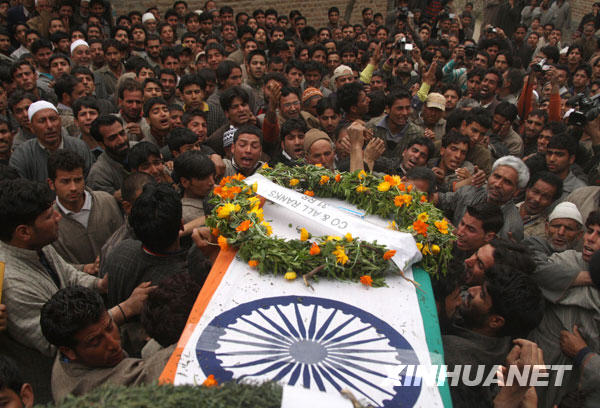 3月24日,在印控克什米爾首府斯利那加以北35公里處的達布,親友們在印度士兵沙比爾·艾哈邁德·馬里克的葬禮上抬著棺木前行。新華社發(fā)(達爾攝)