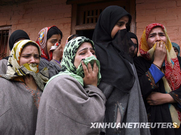 3月24日,在印控克什米爾首府斯利那加以北35公里處的達布,親友們在印度士兵沙比爾·艾哈邁德·馬里克的葬禮上哭泣。新華社發(fā)(達爾攝)