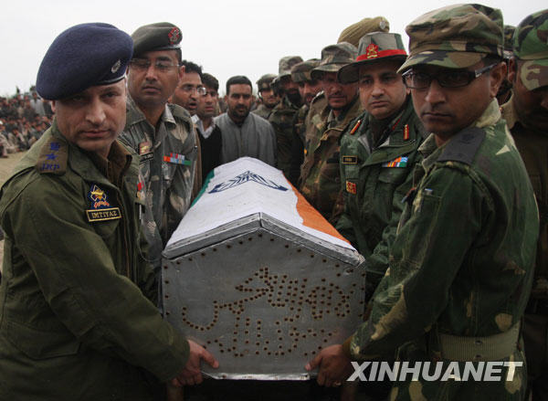 3月24日,在印控克什米爾首府斯利那加以北35公里處的達布,印度軍官和民事警察官員在葬禮上抬著士兵沙比爾·艾哈邁德·馬里克的棺木前行。新華社發(fā)(達爾攝)