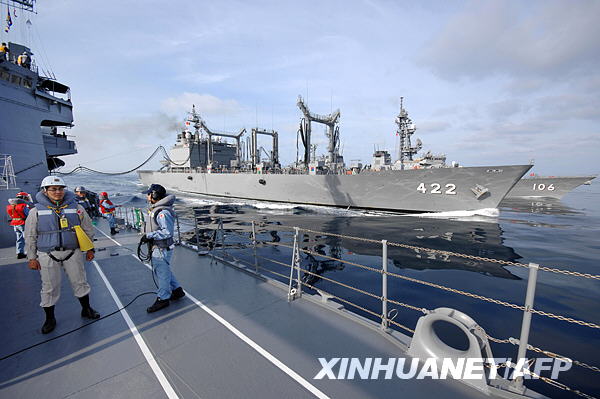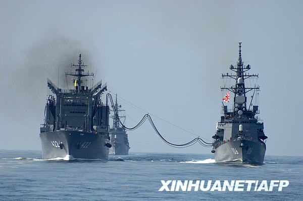 這張3月28日在亞丁灣拍攝的照片顯示,日本海上自衛隊的“十和田”補給艦(右,422號)在為“漣”號驅逐艦(左)加油。