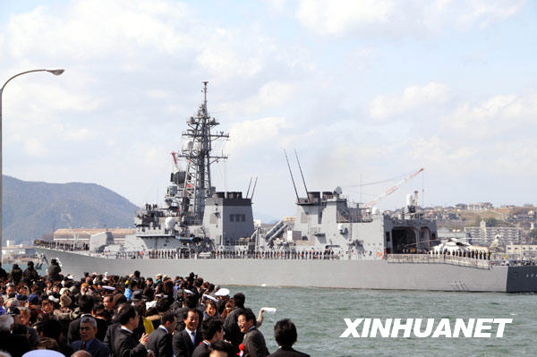 3月14日,“漣”號驅逐艦駛離日本廣島縣的吳基地。日本防衛大臣浜田靖一13日發布命令,啟動“海上警備行動”,向索馬里附近海域派遣海上自衛隊艦艇應對海盜威脅。根據這一命令,駐扎在廣島縣吳基地的“漣”號和“五月雨”號兩艘驅逐艦于14日啟程,預計最早在4月上旬抵達索馬里海域,開始為日本相關船只進行護航。兩艦共有400名乘員,除海上自衛隊特種部隊“特別警備隊”隊員外,還包括8名擁有逮捕海盜等司法權限的海上保安廳官員。新華社記者錢錚攝