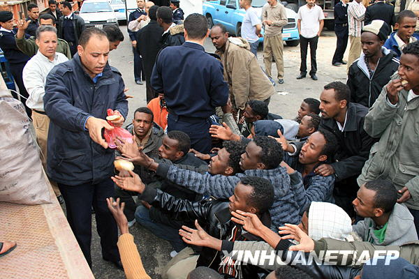 3月29日,利比亞警察向沉船事件的獲救者分發(fā)食物。新華社/法新