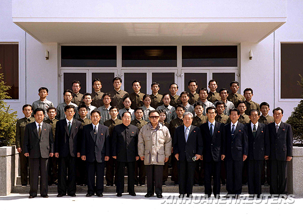 朝鮮中央通訊社4月6日提供的照片顯示,朝鮮最高領導人金正日(前左五)5日在衛星控制綜合指揮所與工作人員合影。據朝鮮中央通訊社6日報道,朝鮮最高領導人金正日5日觀看了朝鮮發射“光明星2號”試驗通信衛星的全過程,高度贊揚科技人員取得的成果。新華社/路透