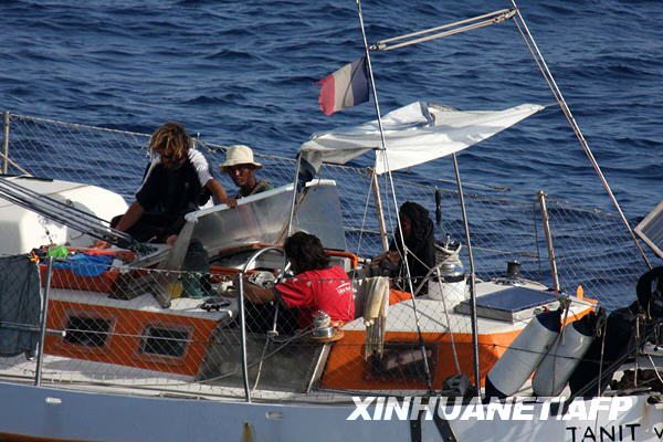這是4月10日拍攝的被索馬里海盜劫持的法國游船以及船上的人質。4月10日,法國海軍對被索馬里海盜扣押的5名法國人質展開營救行動,結果成功救出4人,1人在交火中喪生。據法國媒體報道,一艘載有5人的法國游艇4日在亞丁灣海域被海盜劫持。新華社/法新