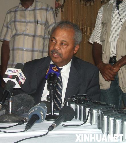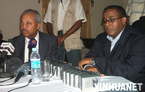 4月13日,美國民主黨國會眾議員唐納德·佩恩(左)在索馬里首都摩加迪沙與索總理奧馬爾·阿卜迪拉希德·阿里·舍馬克出席新聞發布會。當日,唐納德·佩恩乘坐的飛機在離開索馬里摩加迪沙機場時遭炮彈襲擊,所幸沒有人員傷亡。新華社發(阿卜杜勒-拉赫曼·瓦爾薩邁攝)