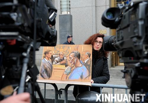 4月21日,在紐約一家聯邦法院外,一位參加了庭審的藝術家在庭審結束后向記者展示她繪制的一幅描繪庭審現場的畫作。當日,被美國海軍俘獲的索馬里海盜阿卜迪瓦里在紐約一家聯邦法院出庭受審。據信,阿卜迪瓦里是一個世紀以來首個在美國受審的海盜嫌疑人,如果定罪,他可能被判處終身監禁。新華社記者申宏攝