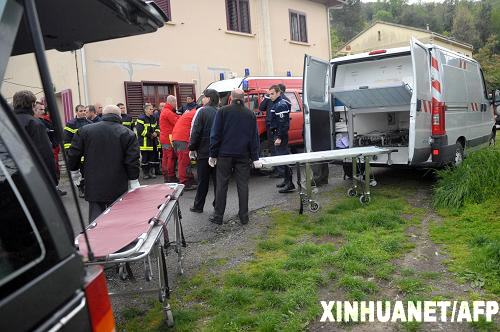 4月26日,在法國科西嘉島巴斯蒂亞南部30公里處的一個村子,救援人員抬著空難遇難者的遺體。法國救援人員當日上午在科西嘉島發現了25日失蹤的一架醫療救助直升機的殘骸,并證實機上5人已死亡,包括正副飛行員、一名女性醫生、一名產婦和一個嬰兒。新華社/法新