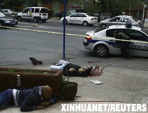 土耳其伊斯坦布爾發生交火事件。4月27日,在土耳其伊斯坦布爾,交火事件中的一名傷者躺在便道上。當天,伊斯坦布爾博斯坦哲區一居民區發生警察和武裝分子交火事件,造成7名警察受傷,其中1人重傷。(新華社/路透)