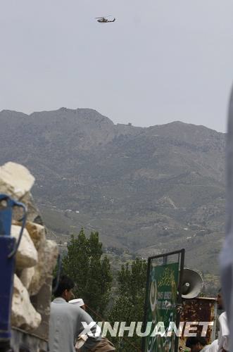 這張4月27日在巴基斯坦迪爾地區(qū)拍攝的照片顯示,巴基斯坦軍方一架參加打擊行動的直升飛機從空中飛過。巴基斯坦內(nèi)政部長馬利克28日說,軍方已經(jīng)在西北邊境省迪爾地區(qū)的行動中打死70名武裝分子。軍方26日開始打擊行動, 目前行動仍在繼續(xù)。新華社發(fā)