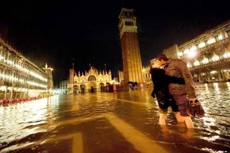 一對情侶在被洪水淹沒的圣馬可廣場上親吻