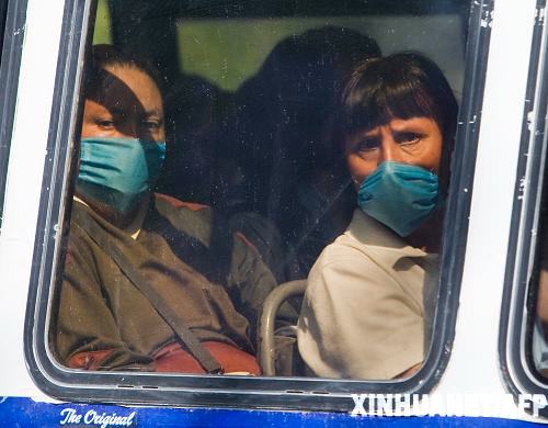 4月27日,在墨西哥首都墨西哥城,兩名戴著口罩的市民向車窗外張望。墨西哥衛(wèi)生部長科爾多瓦當(dāng)日在新聞發(fā)布會(huì)上宣布,墨西哥政府決定從27日開始將停課范圍從原來的疫區(qū)擴(kuò)大至全國,停課包括大中小學(xué)及幼兒園等教學(xué)場所,嚴(yán)防豬流感疫情蔓延。 新華社/法新