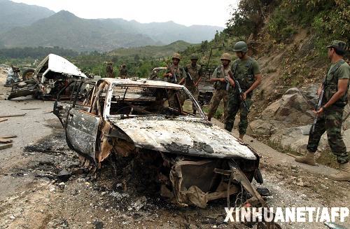 圖為5月3日,巴基斯坦安全部隊(duì)在布內(nèi)爾地區(qū)的被毀車輛旁巡邏。巴基斯坦當(dāng)?shù)仉娨暸_3日報(bào)道,巴安全部隊(duì)從4月底在西北邊境省布內(nèi)爾地區(qū)開始的針對塔利班武裝的軍事行動,已累計(jì)打死80名武裝分子。 新華社/法新