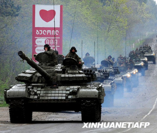5月5日,一隊格魯吉亞坦克行駛在首都第比利斯附近。格內務部5日宣布,格強力部門當天聯合挫敗一起由格高級軍官策劃的軍事叛亂,該叛亂旨在破壞即將于6日舉行的北約軍事演習,并推翻由總統薩卡什維利領導的現政權。新華社/法新