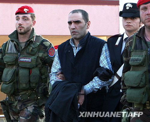 5月10日,在意大利卡拉布里亞地區,當地一個黑手黨頭目薩爾瓦托雷·科盧喬(中)被警方逮捕。新華社/法新