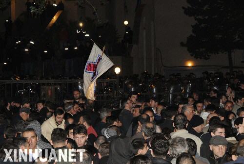 5月6日,近千名格魯吉亞反對派人士封鎖了首都第比利斯市警察局及附近進入市中心的公路入口,要求釋放被警察逮捕的反對派支持者。格反對派從今年4月初開始,在首都第比利斯街頭舉行無限期集會,要求總統薩卡什維利辭職。 新華社記者郭群攝