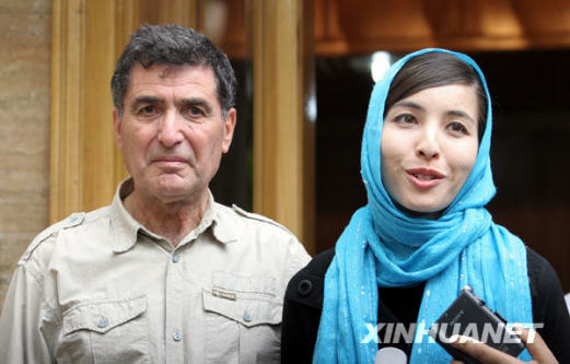 5月12日,在伊朗首都德黑蘭,在伊朗受審的美國女記者羅克薩娜·薩貝里(右)在其住所外與父親里薩·薩貝里共同接受媒體采訪,這是她獲釋后首次公開露面。新華社發(哈拉比薩斯攝)