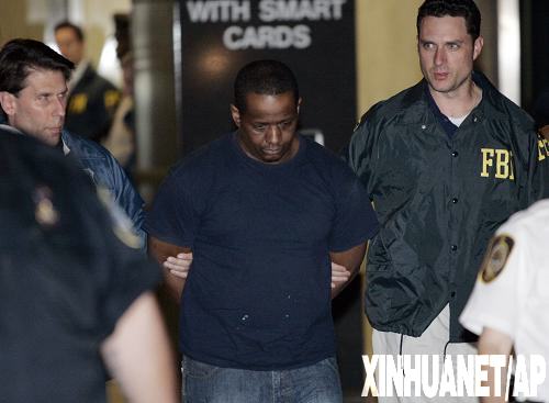 5月21日,在美國紐約,一名恐怖分子嫌犯(中)在被扣留后離開美國聯邦調查局辦公大樓。美國聯邦調查局20日晚在紐約逮捕了4名恐怖分子嫌犯。據當地媒體報道,這4名出生在美國的恐怖分子嫌犯企圖炸毀當地一家猶太教堂,并計劃用導彈擊落美軍戰機。他們還計劃炸毀位于紐約市布朗克斯區的一個猶太人社區中心。新華社/路透