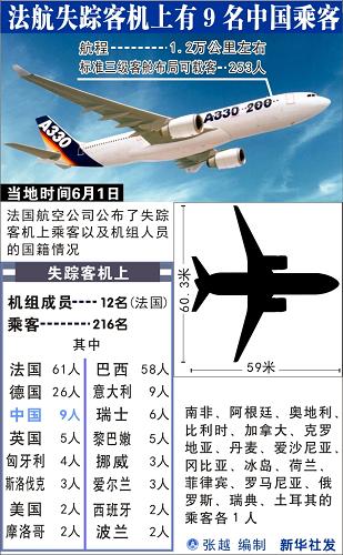 從巴西里約熱內盧飛往巴黎的法航AF447班機格林尼治時間6月1日在大西洋上失蹤,這架飛機上共有228人。法國交通部2日公布了失事飛機乘客名單,稱客機上中國乘客的人數為9名。