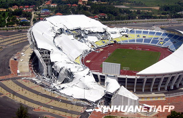 6月2日,在馬來(lái)西亞?wèn)|部的丁加奴州 ,一座體育場(chǎng)的半邊頂棚垮塌。這座發(fā)生垮塌事故的體育場(chǎng)建成僅一年,目前馬來(lái)西亞有關(guān)部門正在對(duì)事故原因進(jìn)行調(diào)查。新華社/法新