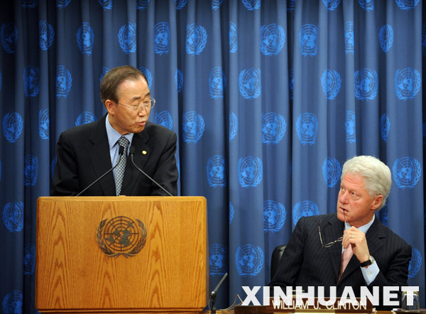 6月15日,美國前總統比爾·克林頓(右)和聯合國秘書長潘基文在紐約聯合國總部共同會見記者。新華社記者申宏攝