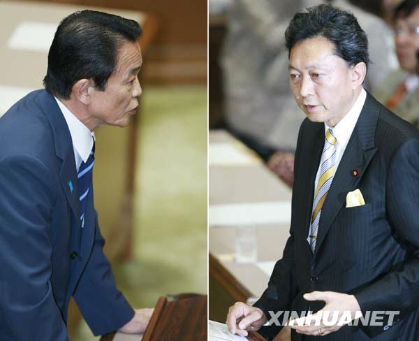 5月27日,在位于日本首都東京的國會參議院,日本首相、執政的自民黨總裁麻生太郎(左)與最大的在野黨民主黨黨首鳩山由紀夫(右)在兩黨黨首辯論會上面對面交鋒(拼版照片)。當日,日本自民、民主兩黨在國會舉行今年首次兩黨黨首辯論會。新華社記者 任正來 攝