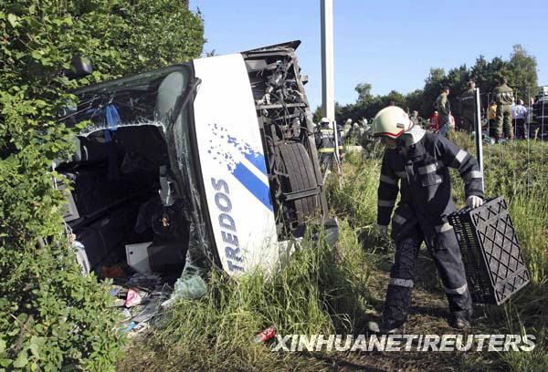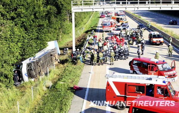6月21日,救援人員在奧地利施蒂里亞州利博赫附近A2高速公路的車禍現場查看情況。奧地利警方稱,32名斯洛伐克學生結束在意大利的旅行乘大巴回國途中遇車禍受傷。新華社/路透