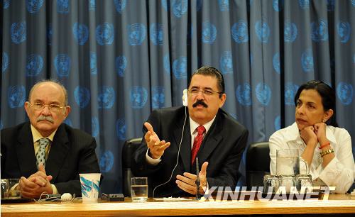 6月30日,在軍事政變中被廢黜的洪都拉斯總統(tǒng)塞拉亞(中)在美國紐約聯(lián)合國總部舉行的記者會(huì)上講話。第63屆聯(lián)大主席布羅克曼(左)出席記者會(huì)。塞拉亞對(duì)第63屆聯(lián)合國大會(huì)剛剛通過的決議表示歡迎,并稱這一譴責(zé)洪都拉斯軍事政變的聯(lián)合國新決議是一份“重要的、具有歷史意義的”文件。新華社記者谷欣容攝