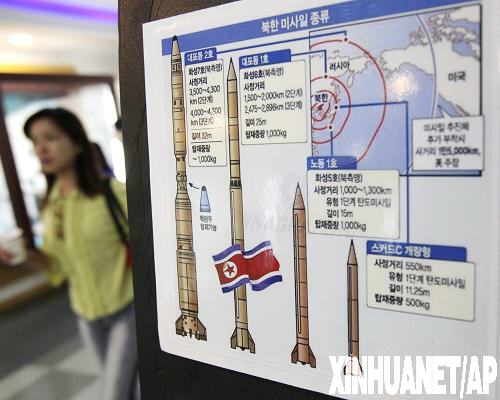 7月2日,在韓國的京畿道坡州的一處觀察哨所,一名韓國游客經過一幅顯示朝鮮導彈系統的圖表。韓國媒體2日援引軍方人士消息報道說,朝鮮于當地時間17時20分、18時和19時50分(北京時間16時20分、17時和18時50分)先后在咸鏡南道咸興市以南地區向海上發射了3枚地對艦導彈。新華社/美聯