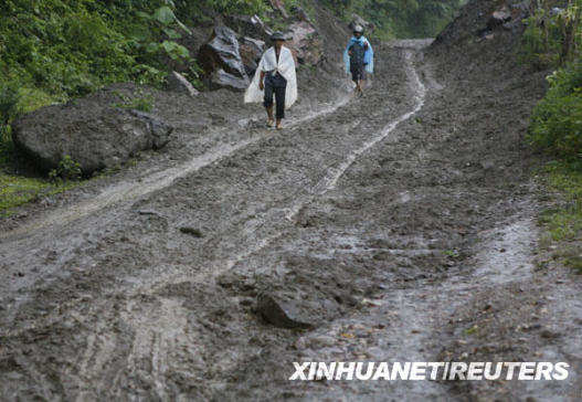 7月6日,在越南北部北件省,人們行走在被洪水沖毀的道路上。越南防洪指導委員會當日說,肆虐3天的山洪已造成至少20人死亡,18人失蹤,越南北部多處道路和房屋損毀。新華社/路透