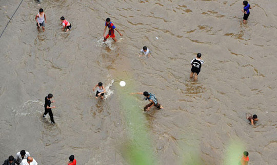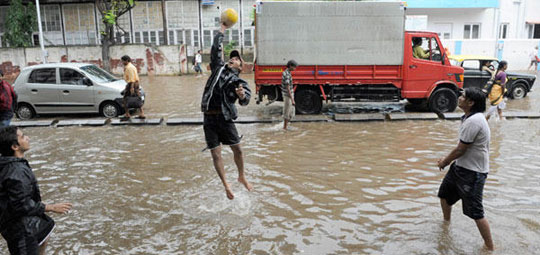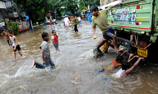 受季風氣候影響,印度孟買數條街道被降雨所引發的洪水淹沒。圖為7月8日當地的孩子們在洪水中玩樂。