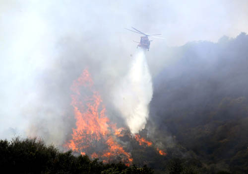 2009年7月8日,美國洛杉磯附件發生山火,市內可見濃煙,一些建筑物里的人群被緊急疏散。