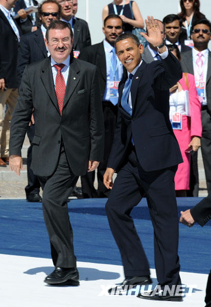 7月9日,在意大利中部城市拉奎拉,美國總統奧巴馬(右)抵達會場。當日,八國集團同發展中國家領導人對話會議在這里舉行。今年與會的發展中國家除了中國、巴西、印度、墨西哥和南非外,還有埃及。新華社記者黃敬文攝