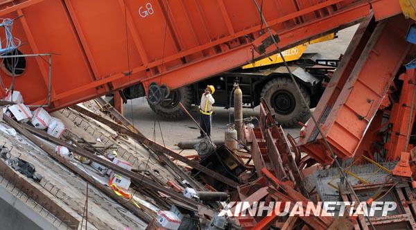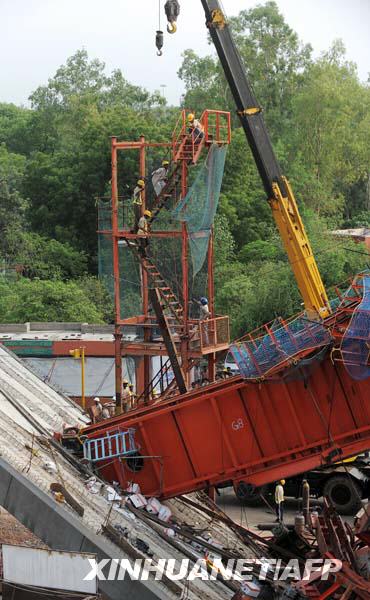 7月12日,在印度首都新德里發生高架橋坍塌事故的現場,救援人員動用吊車清理現場。新華社/法新