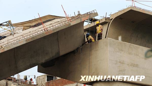 7月12日,工人在印度首都新德里發生的高架橋坍塌事故現場查看。新華社/法新