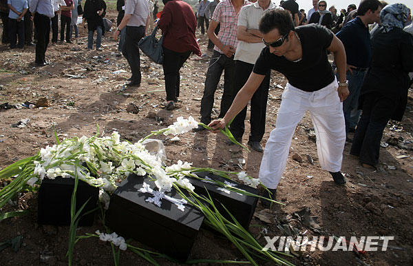 7月16日,在伊朗西北部城市加茲溫附近的墜機現場,一名男子向模擬棺盒獻花。一架由伊朗首都德黑蘭飛往亞美尼亞首都埃里溫的伊朗客機15日在加茲溫附近墜毀,機上168人全部遇難。新華社發(哈拉比薩斯攝)