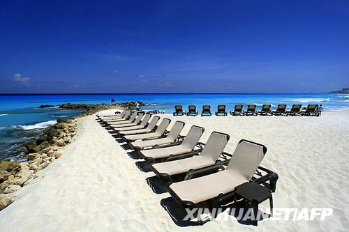 5月12日拍攝的照片顯示墨西哥旅游勝地坎昆海灘上見不到一個游客。甲型H1N1流感使墨西哥旅游業遭受重創。墨西哥地方官員11日說,游客銳減已迫使旅游勝地坎昆等地的25家酒店關門。墨旅游促進委員會公布最新預測稱,2009年墨西哥旅游業盈利將比2008年減少近三成。新華社/法新