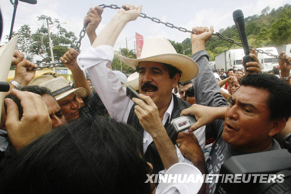 塞拉亞于當地時間24日下午14時27分順利通過尼加拉瓜與洪都拉斯交界的拉斯瑪瑙斯口岸,在支持者的簇擁下雙手舉起了象征著洪都拉斯國境線的鐵鏈,踏上了洪都拉斯國土。