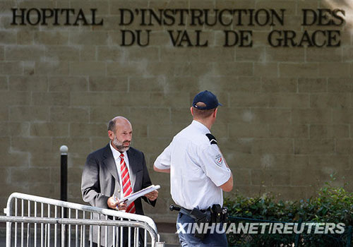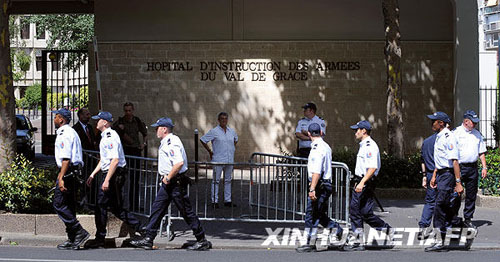 7月26日,安全人員在法國首都巴黎的瓦勒德格拉斯軍隊醫院門口警戒。當日,法國總統薩科齊因身體不適,被送往瓦勒德格拉斯軍隊醫院接受檢查和治療。隨后,法國總統府秘書長克洛德·蓋昂向媒體表示,薩科齊目前仍在醫院接受治療,不過他的病情已無大礙。 新華社/法新