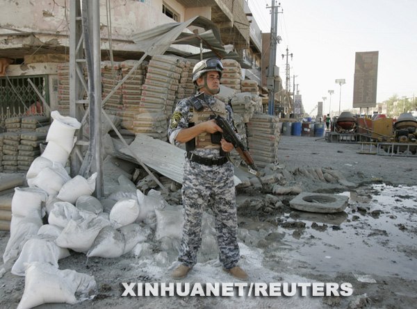 8月10日,在伊拉克首都巴格達的阿米勒社區,一名伊拉克警察在汽車炸彈爆炸現場警戒。新華社/路透