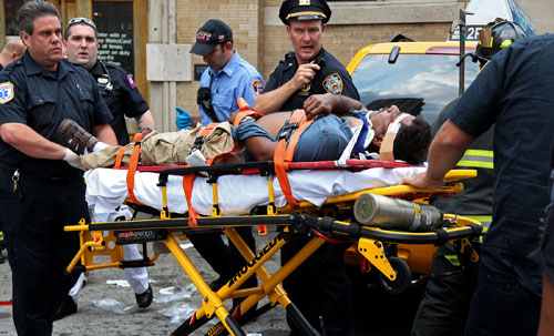 8月18日,美國紐約市內一輛計程車撞上第72街與百老匯相鄰的地鐵站,3人受傷。圖為急救人員在現場進行救援。