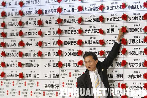 8月31日,在日本首都東京,日本民主黨黨首鳩山由紀(jì)夫站在民主黨候選人名單展板前。日本國(guó)會(huì)眾議院選舉最終結(jié)果于31日凌晨揭曉。最大在野黨民主黨獲得眾議院全部480個(gè)議席中的308席,超過(guò)控制眾議院各個(gè)常設(shè)委員會(huì)的絕對(duì)穩(wěn)定多數(shù)269席,取得空前勝利。 新華社/路透