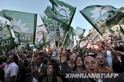 泛希運動的支持者在首都雅典街頭狂歡慶祝。帕潘德里歐大選前承諾,投入45億美元刺激希臘經濟,并投資發展清潔能源,包括太陽能、風力發電等。