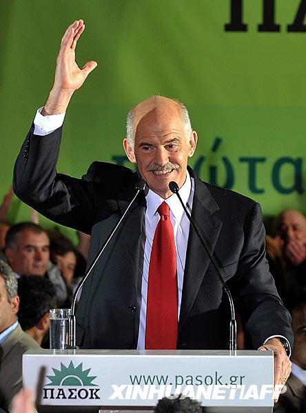 10月4日,在希臘首都雅典,希臘最大反對黨泛希臘社會主義運動(泛希社運)的領導人帕潘德里歐向支持者講話,慶祝勝利。希臘內政部初步統計結果顯示,帕潘德里歐及其領導的泛希社運在當日舉行的議會選舉中領先執政黨新民主黨,獲得勝利。 新華社/法新