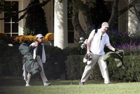 奧巴馬10月25日來到高爾夫球場一顯身手,在陪伴他的人中出現(xiàn)了一位女性的身影