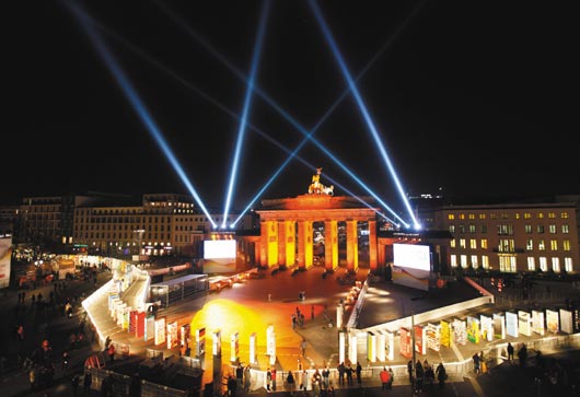 在靠近知名地標布蘭登堡大門的圍墻舊址上,立起約1000個巨型骨牌,將在9日柏林墻倒塌20周年的紀念日,象征性將它再度推倒。