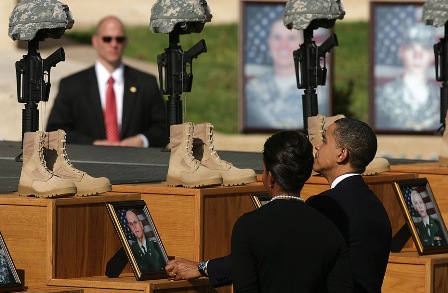 奧巴馬在遇難者悼念儀式上發(fā)表了講話。登上講臺后,他示意聚集現(xiàn)場聽眾安靜下來,然后開始逐一介紹每一名遇難者的姓名、軍銜、履歷等,回顧了他們的家庭、生活情況以及對軍隊的貢獻。