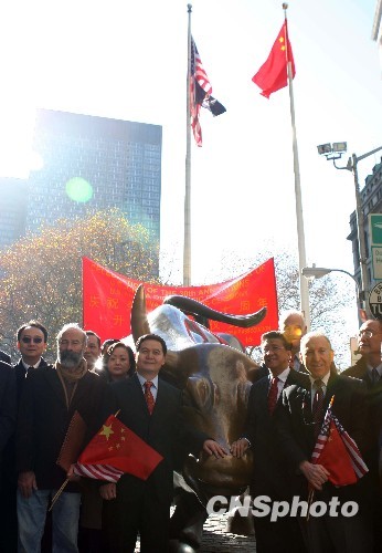 這是紐約歷史上,中國(guó)國(guó)旗第一次在華爾街銅牛前升起。活動(dòng)主辦方、美中友好協(xié)會(huì)會(huì)長(zhǎng)張錦平表示,“對(duì)于今天的美中關(guān)系來(lái)說(shuō),這具有很好的象征意義。希望美中關(guān)系能如同華爾街銅牛所代表的那樣,永遠(yuǎn)蒸蒸日上”。