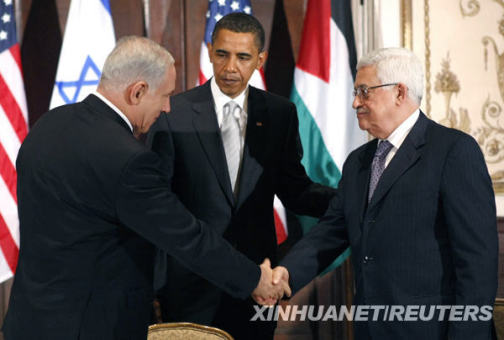 資料圖片: 9月22日,在美國(guó)紐約,美國(guó)總統(tǒng)奧巴馬(中)與以色列總理內(nèi)塔尼亞胡(左)和巴勒斯坦民族權(quán)力機(jī)構(gòu)主席阿巴斯舉行三方會(huì)談。新華社/路透