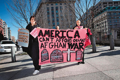 一批反戰人士前天到白宮外示威,身穿黑衣服抬棺材抗議,指摘當局為增兵而犧牲醫療和教育改革。多個反戰組織2日起在紐約、華盛頓等全美十多個城市,發起一連串示威游行。
